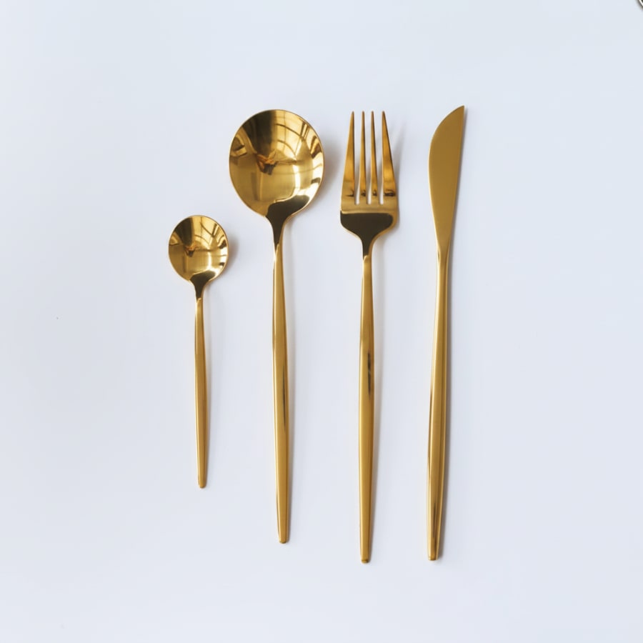 Color: Gold Size: main knife-8.7″x0.6″ weight:39g ; main fork-8.3″ x 1″ weight:27.5g ; main spoon-8.3″x3.3″ weight:33.5g ; dessert spoon:5″ x 1″ weight:12.5g Material: High Quality Stainless Steel